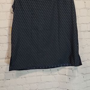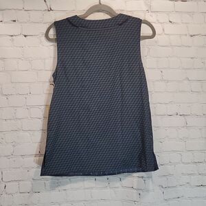 New with tag no flaws. Navy blue, teal, black, and white mixed print. Lightweight polyester with side slits. V neck.