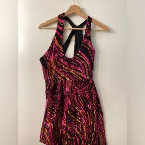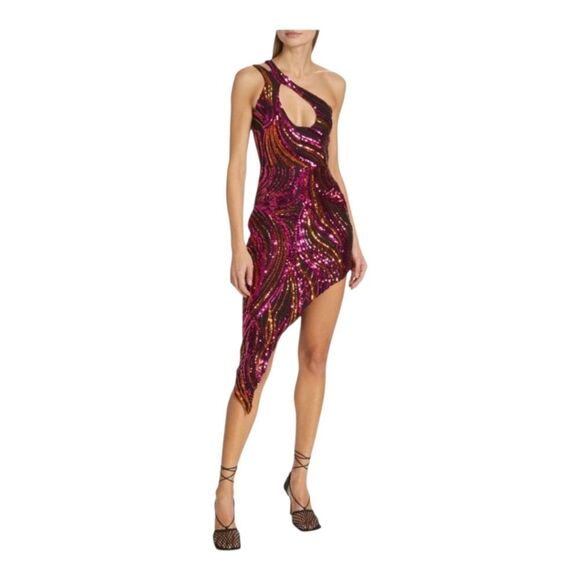 Finished in a wavy sequined pattern, this sleek Halpern minidress features asymmetric lines at the hem and bodice. This charming piece features a large cut-out at the chest adding to its dynamic silhouette.