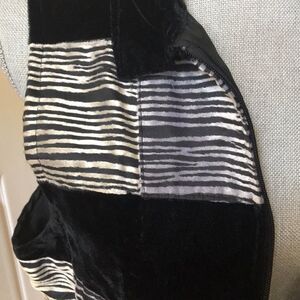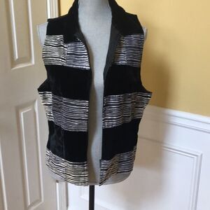 This vest has the appearance of velvet and animal print on the front with a black silk-like back. Zipper closure. 14” across chest, 20” underarm across, 23” shoulder to hem. Size XL.