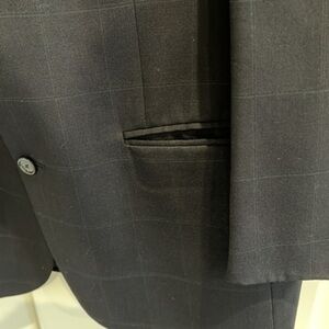 Halston 2 button Suit Jacket. Due to weight loss, this suit jacket needs to be rehome. Any questions, please ask! It has been dry clean, smoke and pet free home. Open to offers. Color is navy with light square pattern. 100% wool.