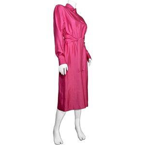 HALSTON 1980s Long Sleeve Flap Collar Loose Fitting Lightweight Concealed Button Down Closure Iridescent Mid Length Dress Including Waist Tie And Interior Side Seam Pockets Made In Hong Kong