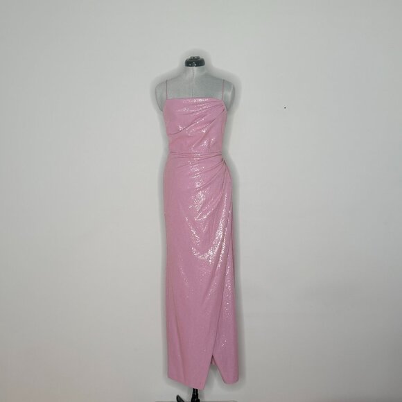 Turn heads in this stunning floor-length wisteria pink sequin gown by Halston. It features adjustable spaghetti straps, a gentle drape across the bust, and gathered draping on the side, complemented by a front skirt overlay creating a side slit. Like new, with no visible rips, tears, or stains. Perfect for a feminine, formal evening!