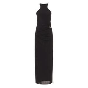 Sophisticated chic bodycon gown in a silky jersey knit featuring a halter neckline, cut away sleeves and a racer back, high side slit , ruched belt allows for you to adjust the waist line as youlike, Perfect resortwear piece, going out, date night, cocktail, wine tasting, semi-formal, holiday party, new years.
