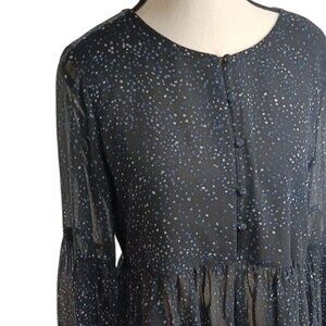 Excellent Condition. Semi Sheer, Balloon Sleeve, Abstract Polka Dot, Lined Up To the Waist, Half Button Measurements: Length 26", Pit-to-Pit 18.5"