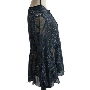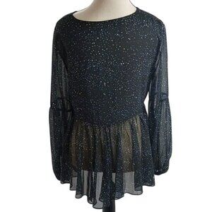 Halston Blouse Black Blue Polka Dot Semi Sheer Balloon Sleeve Ruffle Size S
