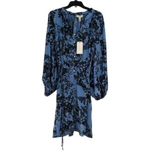 Halston dress featuring a striking blue and black floral print pattern. Balloon sleeves add dramatic flair offers versatile styling. Perfect for special occasions, dinner parties, or upscale casual events. Features button details at neckline and drawstring waist for adjustable fit. New with tags.