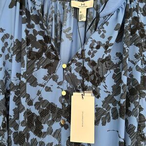 Keywords: halston, floral print, balloon sleeves, blue dress, special occasion dress, long sleeve dress, drawstring waist, button detail, new with tags, cocktail dress, party dress