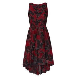 Red and black printed tulle hourglass dress. Sleeveless. Crew neckline. Hidden back zipper with hook and eye closure. Fully lined. 38” from shoulder to shortest hemline.