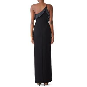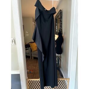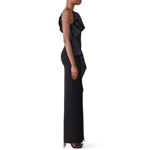 Black heavy crepe (100% Polyester). Gown. Sleeveless. One shoulder neckline. Hidden side zipper closure. Fully lined. See size and fit tab for length. Imported.