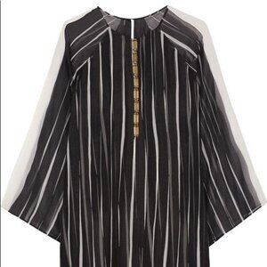 Halston Heritage Black Stripe Mini Dress, Crinkle Chiffon, Gold Detail, Sz. XL