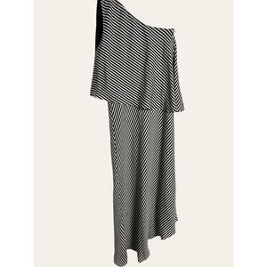 Halston Heritage Black White Striped Asymmetrical One Shoulder Midi Dress XS