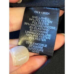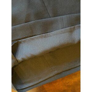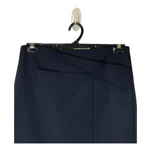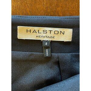 This skirt by Halston Heritage is in excellent condition. It is in solid black color. It features; faux wrap, twist detail at waist, hidden back zipper closure, a-line silhouette, and a mini length and is crafted from a polyester and viscose blend. It is lined.