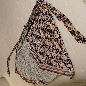 Chic wrap skirt with a bold floral design. Features black, orange, yellow, purple, and white hues. Waist not stretchy. Beautiful desaign with beautiful colors. The look and feel of silk. Washable. I will wash and steam it before shipping.