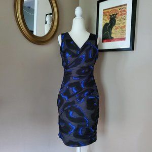 Blue, black and gray print fitted sleeveless mini dress. Soft and stretchy fabric. Pleated accents, ruching, V-neckline, hidden side-zip closure, fully lined.