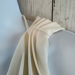 Details: Rayon/Polyester, knit construction, sleeveless with wide pleated straps and bra keep snaps, cowl neck, lined, low back with a tie closure, dry clean.