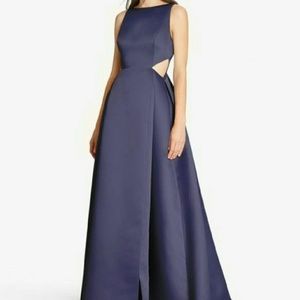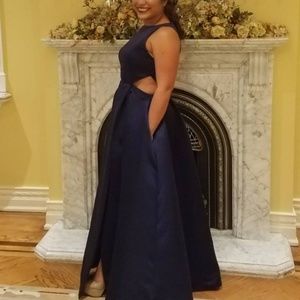 Beautiful Halston Heritage A-Line Evening Gown. Boatneck collar, pockets & waist cutouts for a trendy twist on a classic shape.