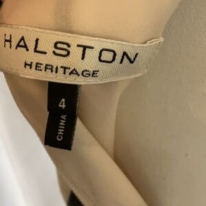 Eye catching and flattering! This Halston Heritage dress is fabulous in the front and back! This fit to flare dress offers a high neck with contrasting spaghetti strap. Geometric pattern of cream & black. Lined. Size 4