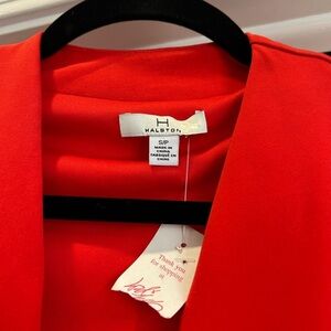 Chic and bold maxi dress by Halston Heritage. Features a striking red hue and elegant draping. Perfect for formal events.