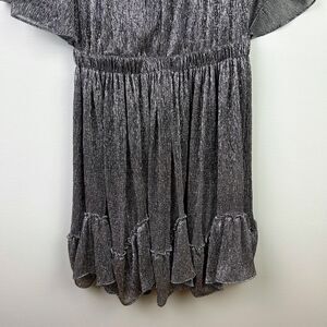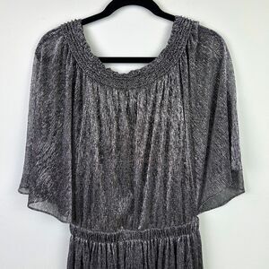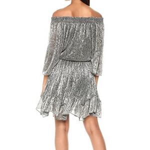 Halston Heritage Metallic Silver Off the Shoulder Pleated Mini Dress. This stunning futuristic dress features a smocked stretch off the shoulder neckline with quarter length flutter sleeves, a fitted stretch waist, delicate mini pleated chiffon fabric with metallic threading, and a flare mini length skirt with flirty ruffled hem detail. Perfect to fulfill all your whimsigoth fairy fantasies! Women's size extra small XS, measurements pictured. Excellent used condition.