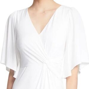 Halston Heritage NWT draped jersey gown in chalk (white). Jersey fabrication, surplice v-neckline, flutter elbow sleeves, center front twisted knot & ruching detail. Hidden back zipper with hook & eye & fully lined.