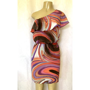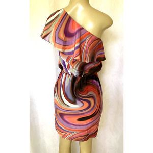 Halston Heritage One Shoulder Ruffled Dress Swirl Silk Mini Orange Purpl…