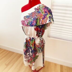 Step into a world of vibrant elegance with this Halston Heritage one shoulder hammered silk dress. This stunning piece features a captivating coral print in bright hues ranging from pink to green, making it a showstopper for any occasion. Crafted from the most luxurious hammered silk, the texture of this dress offers an unparalleled touch of sophistication and comfort.