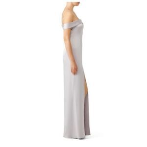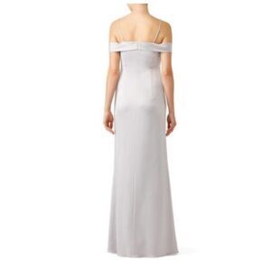 Silver crepe de chine (100% Polyester). Gown. Sleeveless. Off the shoulder neckline. Adjustable straps. Hidden back zipper with hook-and-eye closure. Partially lined. See size and fit tab for length. Imported.