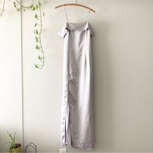 Column silhouette and muted silver hue ensure a flattering look. Plus, a side-slit adds an extra alluring touch.