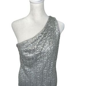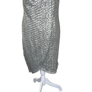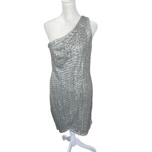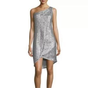 Halston Heritage Silver Sequin One Shoulder Faux Wrap Tulip Mini Dress 6