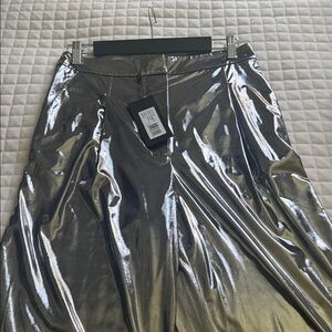 Shiny silver wide leg pants. Sleek and stylish design. Perfect for a bold holiday look!