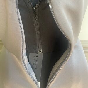 Stunning Halston Heritage Strapless. Butter soft material with great structure. Front slit exposes the short interior skirt to show off some leg. Side slit pockets. Asymmetrical bodice.