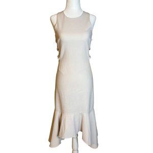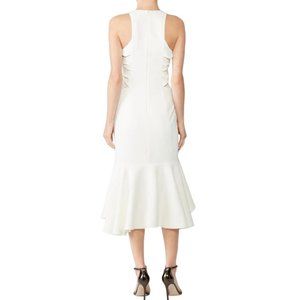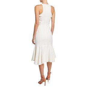 Elegant white midi dress. Features a flared hem. Sleeveless design. Perfect for special occasions.