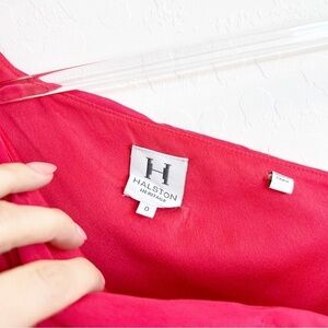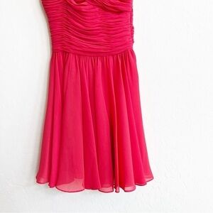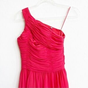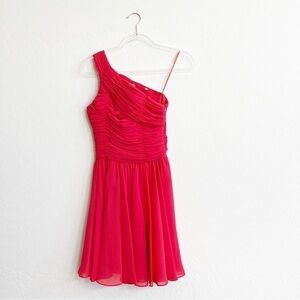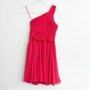 Halston Heritage one-shoulder ruched mini dress. Chiffon material, pretty coral color. Excellent condition, just had it professionally dry cleaned so it’s ready to wear!