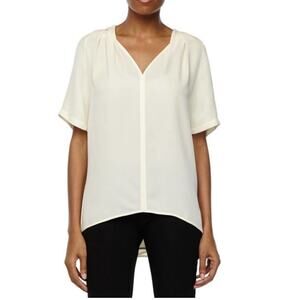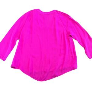 Halston Heritage silk blouse, bright magenta, pink/purple, slight pleat detail on shoulder and trim down center, v-neck, 100% silk, modeled photo is the same style in a short sleeve version