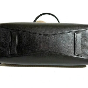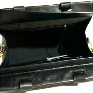 Halston Heritage black leather satchel handbag with gold tone hardware main compartment 3 pockets at interior wall 1 zip closure fabric lining snap closure at front minor scratches shoulder strap is replaced not halston strap hight 9” wide 12” depth 4” strap drop 6”22” adjustable