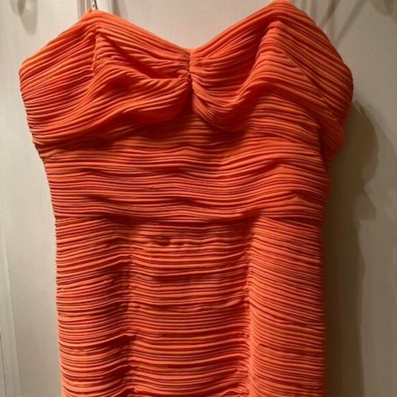 Flowy and flattering strapless coral Halston Heritage gown that moves in all the right places. Perfect for summer wedding guest or prom.