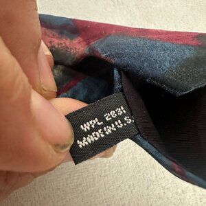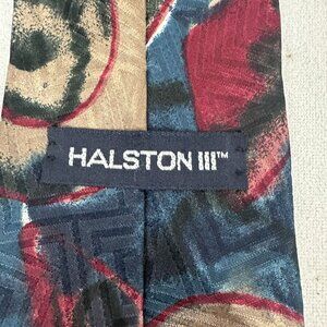 This Halston III men's necktie features a striking abstract pattern in shades of blue, red, and gold. Made in the USA from 100% polyester, it offers durability while maintaining a stylish and sleek appearance. The detailed design makes this tie an excellent accessory for professional or semi-formal attire.