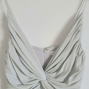 The Halston Jody pleated midi dress boasts a deep, knotted V-neck, spaghetti straps, square back, and asymmetrical hem. A swing silhouette and crafted metallic material elevates this shimmering style. Color is silver.