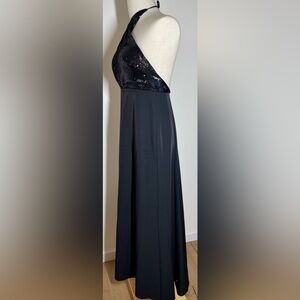 Halston “Lacey” gown in black crepe fabric and sequined halter, women’s size 12.