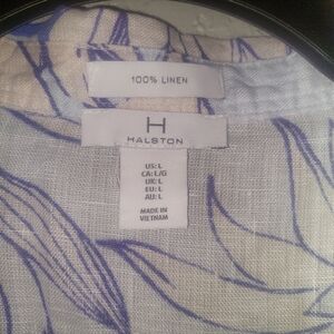 Halston Linen Women Large Top Shirt Tunic Blouse Blue Floral Button Down