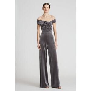 Halston Off the Shoulder Wren Steel Velvet Jumpsuit Ruched Wide Leg Size 4 NWOT