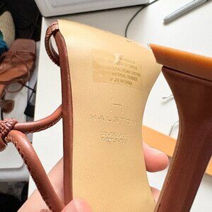Elevate your shoe game with these stunning Halston Picasso sandals. Featuring a square toe and ultra-high spool heel, these strappy sandals are perfect for any occasion. The tan brown color and faux leather upper material add a touch of sophistication to your outfit.