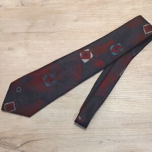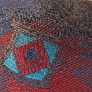 This sophisticated silk 4" retro style tie from HALSTON III features a 100 percent silk textured fabric, geometric design in red, black, blue, and gray...yet the statement is subtle. The background is black as seen in pictures one and two. Take control of that next board meeting Mr. Madman! Bundle three ties for $30!