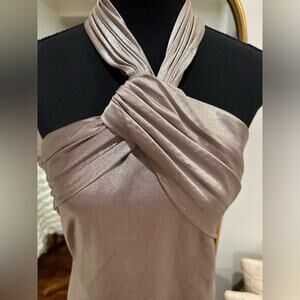 Halston's elegant Raelynn gown is crafted of metallic crepe. This column style flaunts a halterneck with gathered detail.