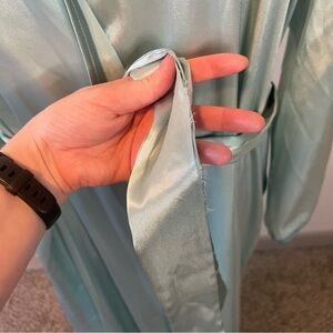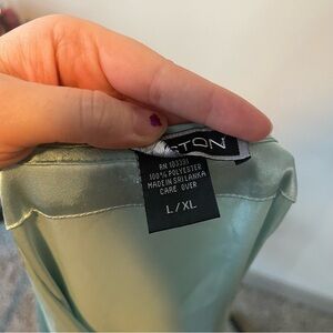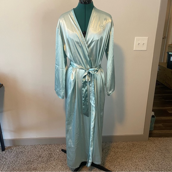 Halston mint/sea foam green long sleeve long robe, embroidered logo on the chest. Size L/XL. No holes or stains, there is some wear/fraying on the belt tie though. Roughly 50 inches long.