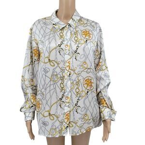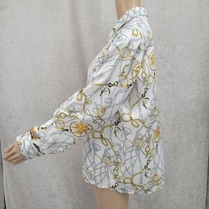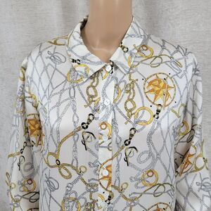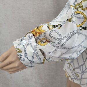 Halston Silk White and Gold Nautical Print Blouse Long Sleeves French Cuffs