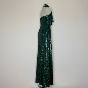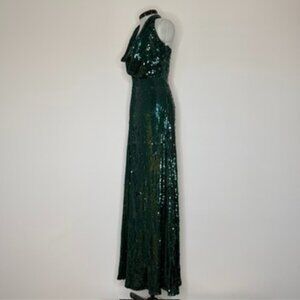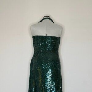 This Halston gown is really something special! Featuring dazzling emerald sequins and a beautifully draped neckline, it's guaranteed to turn heads at any formal event.