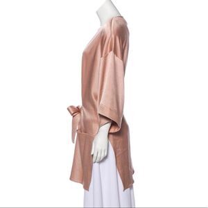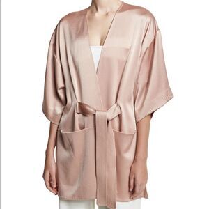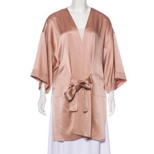 Halston Heritage satin kimono wrap jacket.Multi-needle topstitching at cuffs and sash.Open front.Half-sleeves; dropped shoulders.Deep pockets at front