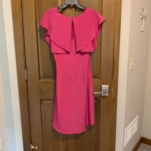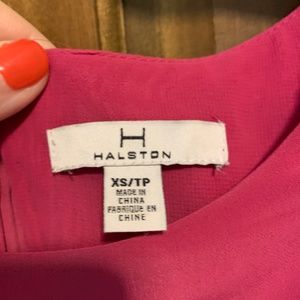 Beautiful Halston deep pink/fuchsia party dress. Short, flutter sleeves. High-low hem. Clean drape that narrows at waist and flares slightly at bottom. Fully lined. Simple design that wears beautifully.