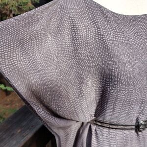 Animal print, fully lined. Shift shape can be worn belted or without. The belt I included is not original to the dress, but I think it works.I like the dress better unbelted. Size L measures 40 at chest and waist, 44 at hips, 39 long from shoulder to hem. Fluttery sides, so unusual and pretty.